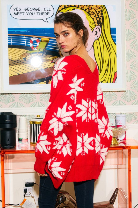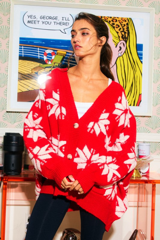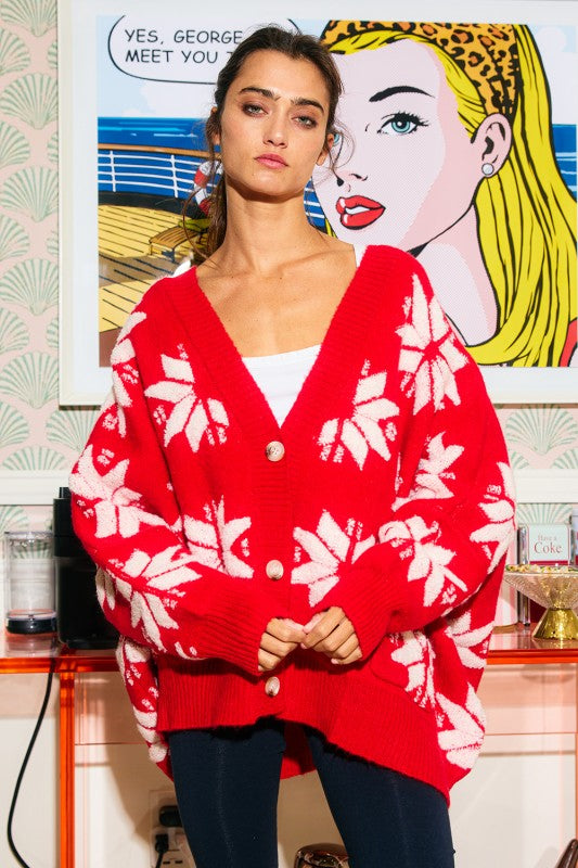 Oversized Winter Star Snowflake Pullover Sweater Cardigan - V-neckline - Long drop-shoulder sleeves - Open front and button down - Side pockets - Oversize silhouette